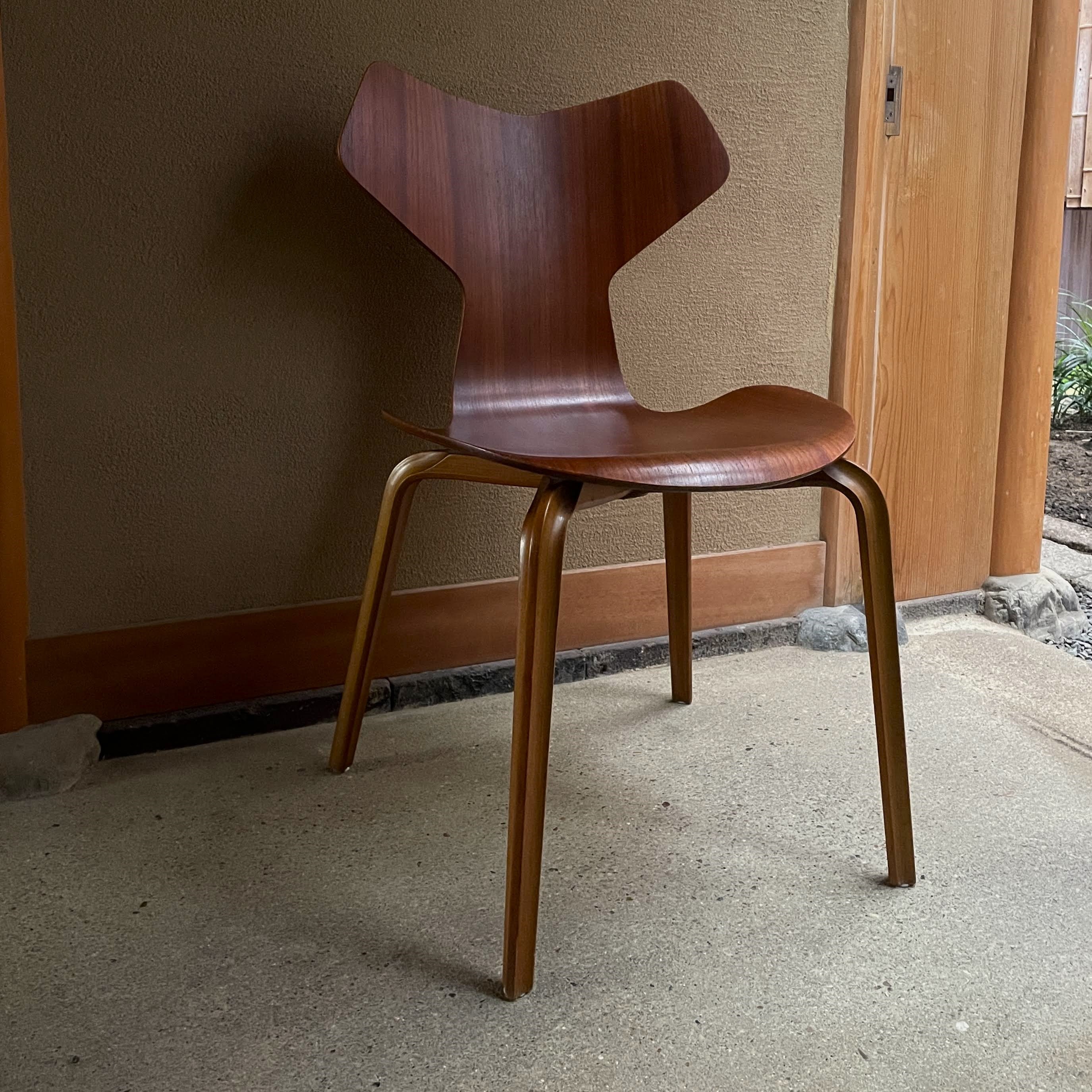 グラフィカルなフォルムが印象的なグランプリチェアは、1957 年にコペンハーゲンのデンマーク工芸博物館において開催された春の展示会で初公開されました。アーネ・ヤコブセン (Arne Jacobsen) によりデザインされたこのチェアは、同年のミラノ・トリエンナーレでグランプリを獲得、以来グランプリチェアと呼ばれています。グランプリチェアの脚は木でできていますが、ヤコブセンのほかの成形合板の椅子のスチール脚にならって、滑らかに角度を描きながら広がります。木の脚のモデルは、ヤコブセンがデザインしたもののなかでも珍しいものとなっています。
