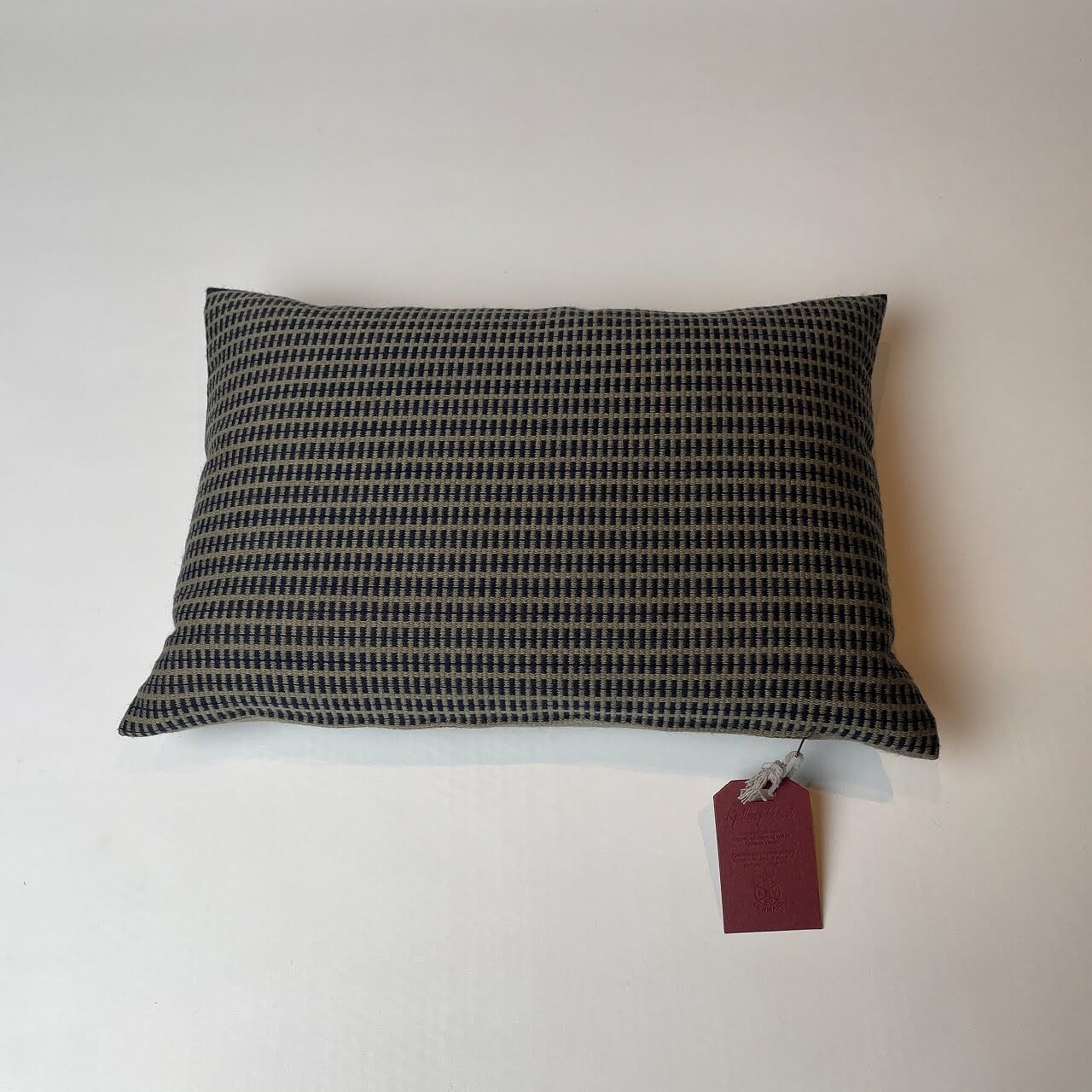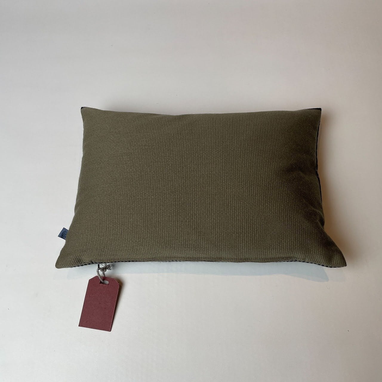 KV21クッションはリバーシブル仕様で、片面には繊細で洗練されたパターン、もう片面には落ち着いた無地のテキスタイルが配されており、一辺には印象的なストライプがアクセントとして織り込まれています。このデザインにより、空間や気分に合わせて表情を変えられる高い汎用性を持っています。