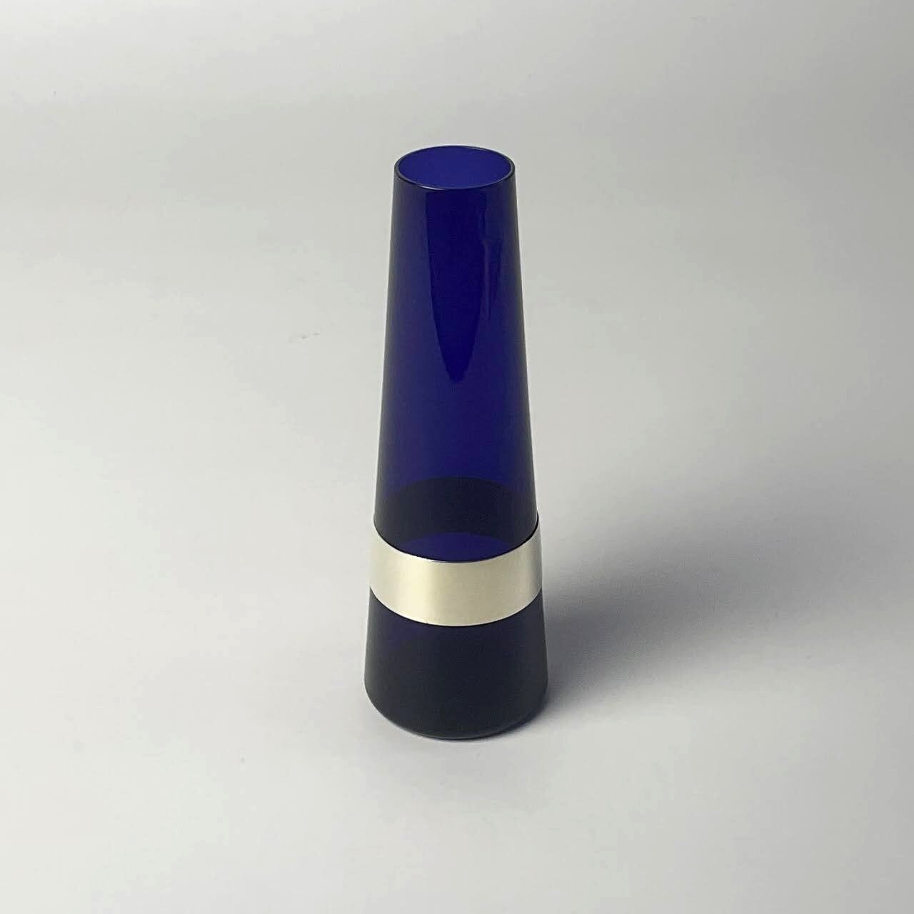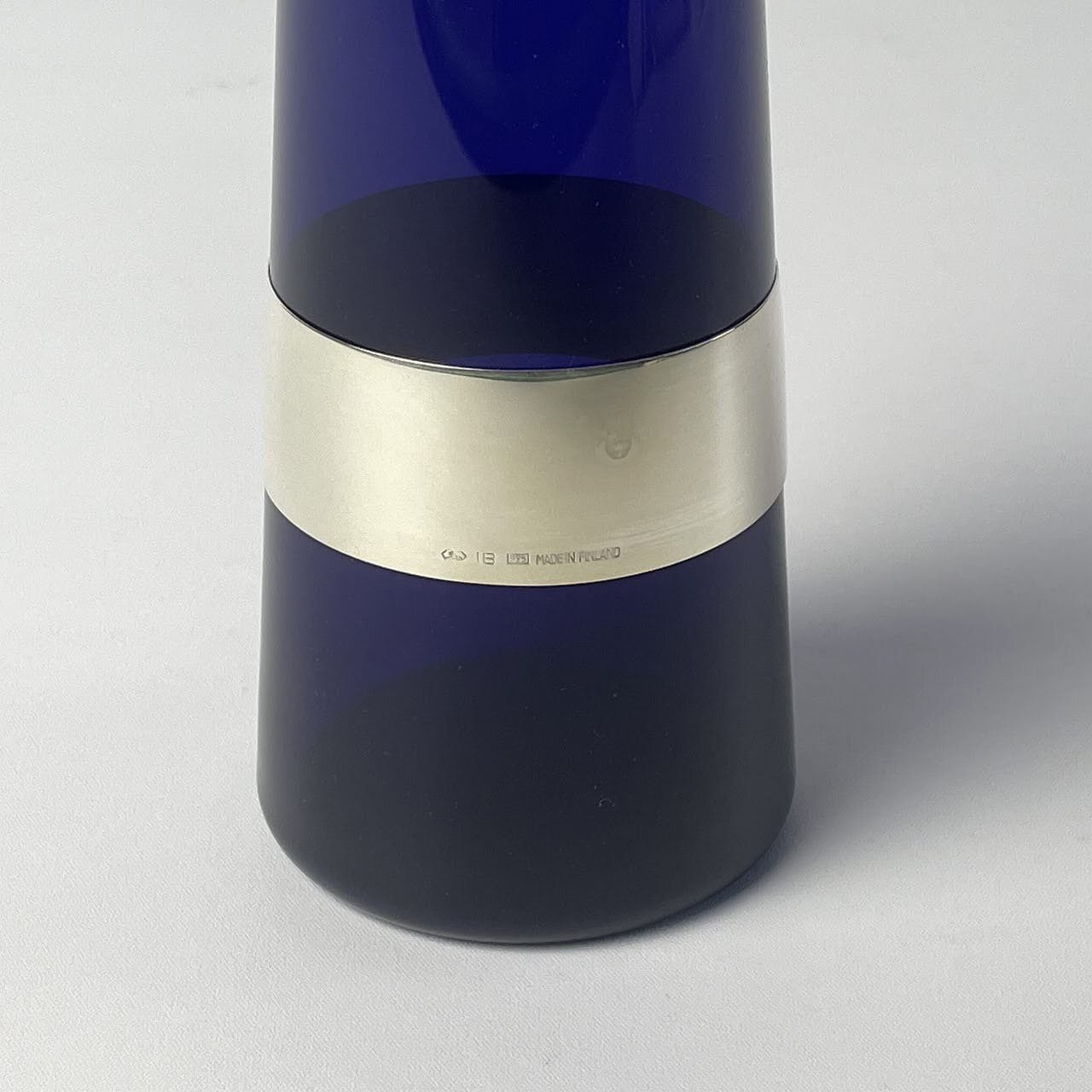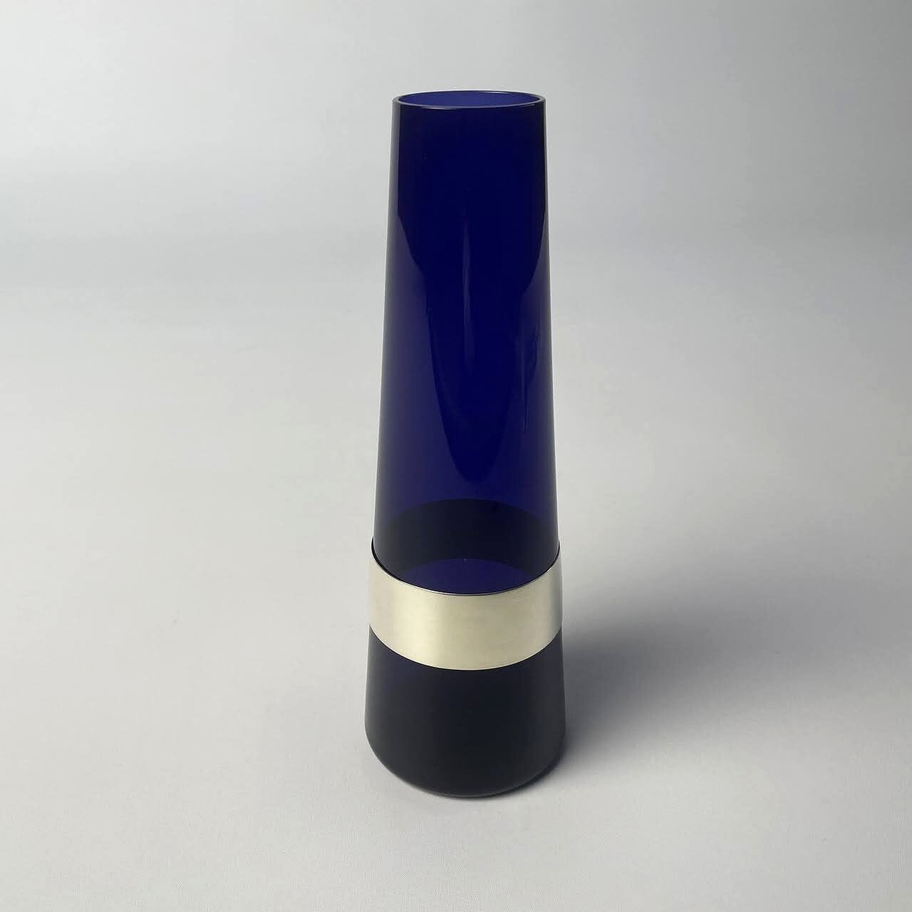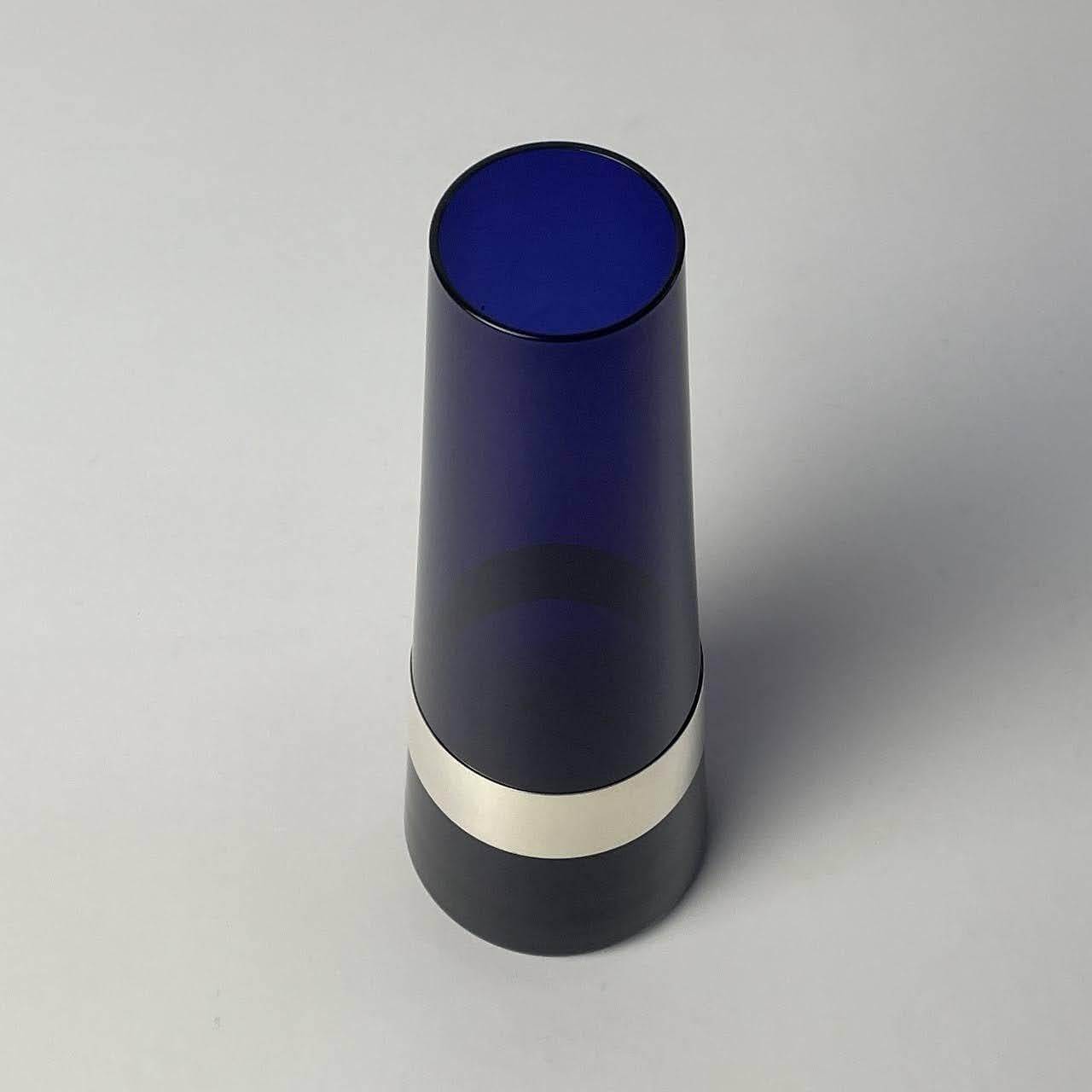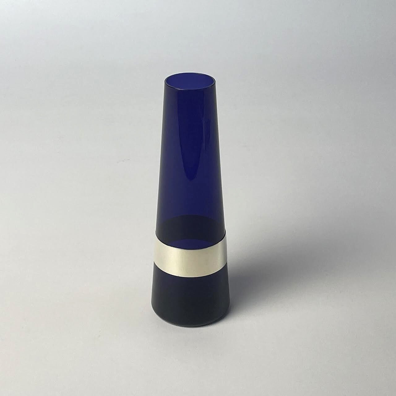 フィンランドのデザイナー、サーラ・ホペア(Saara Hopea)によるブルーのフラワーベースです。深く澄んだブルーガラスをぐるりと取り囲む繊細なシルバーのアクセントが光を受けて、まるで水面に反射する光のように煌めきます。