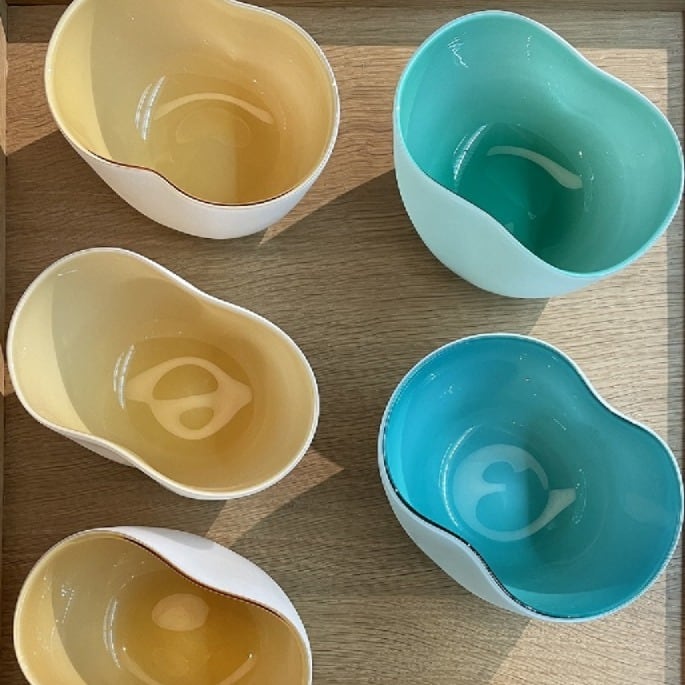 ラウラ・デ・サンティラーナは、彼女の祖父が興したムラノのガラス工房に生まれ、多くの優れたガラス職人や芸術作品に囲まれて育ちました。以前から「極められたシンプルさ」をもつ日本古来のデザインに惹かれていた彼女と弊社の出会いは30年以上も前にさかのぼります。イタリアのムラノという小さな島で何世紀にもわたって磨かれてきた技術を和食器を通して表現できないものかと、料亭の夏の席用に相応しいガラス器、Sei Sensiシリーズを生み出しました。