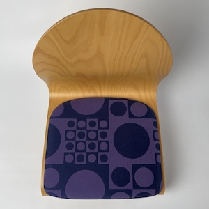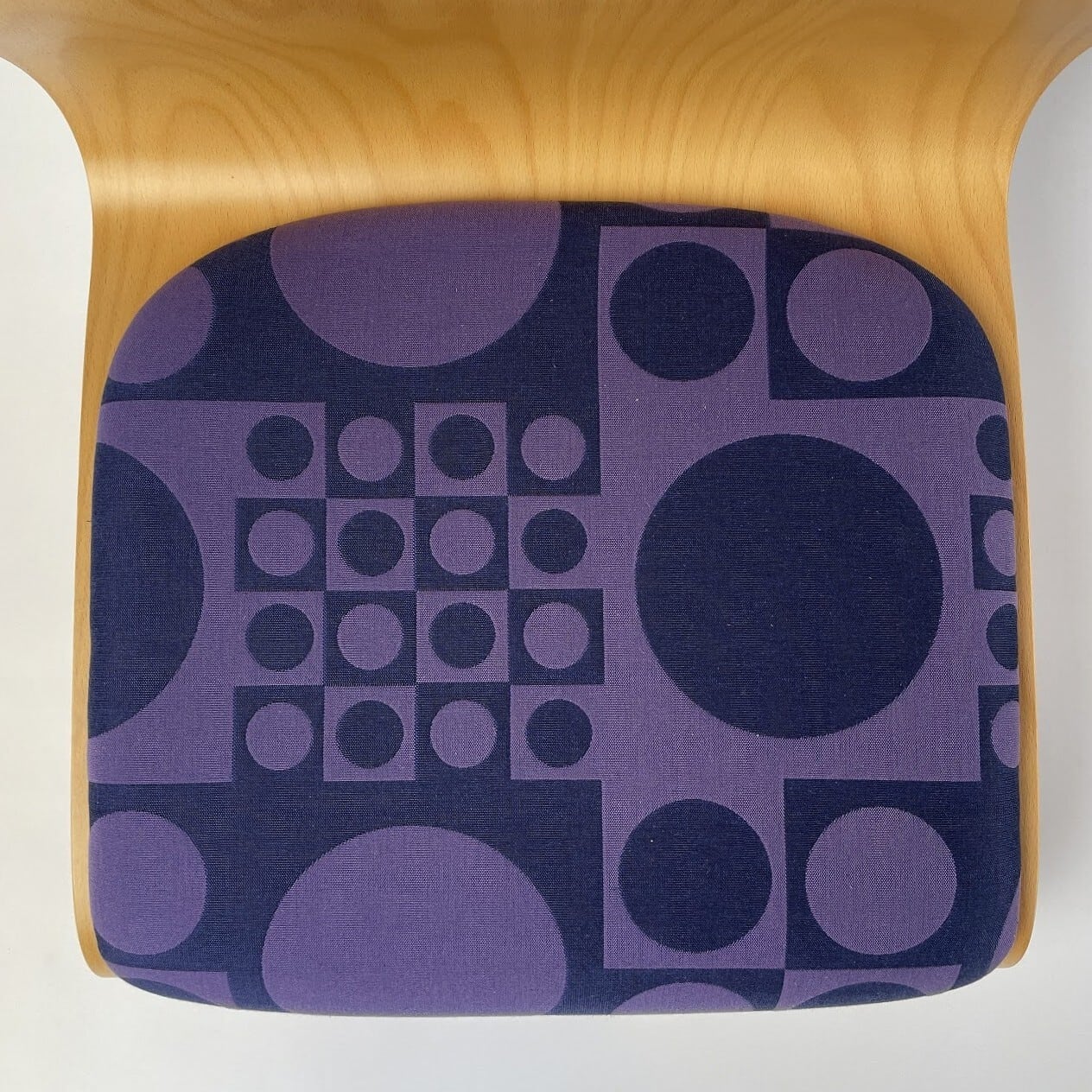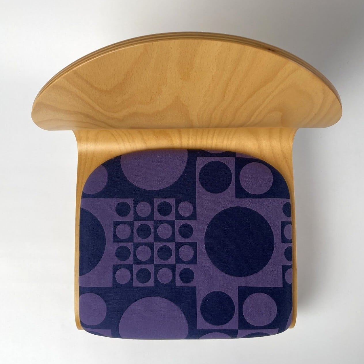 この座椅子に張られたのは、ヴァーナー・パントンによる幾何学的造形を ファブリックメーカー、マハラム(Maharam)社のジオメトリ (Geometri) シリーズが美しく表現したものです。