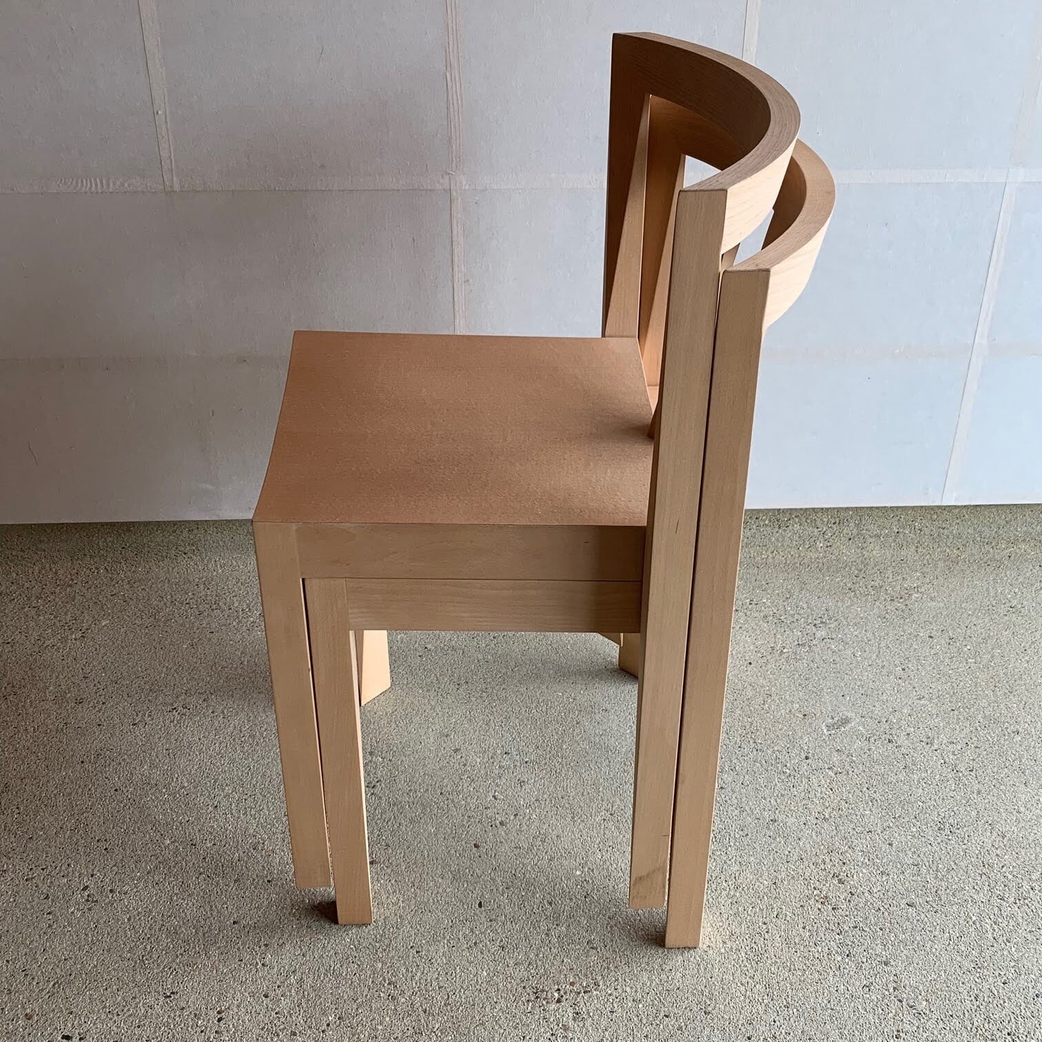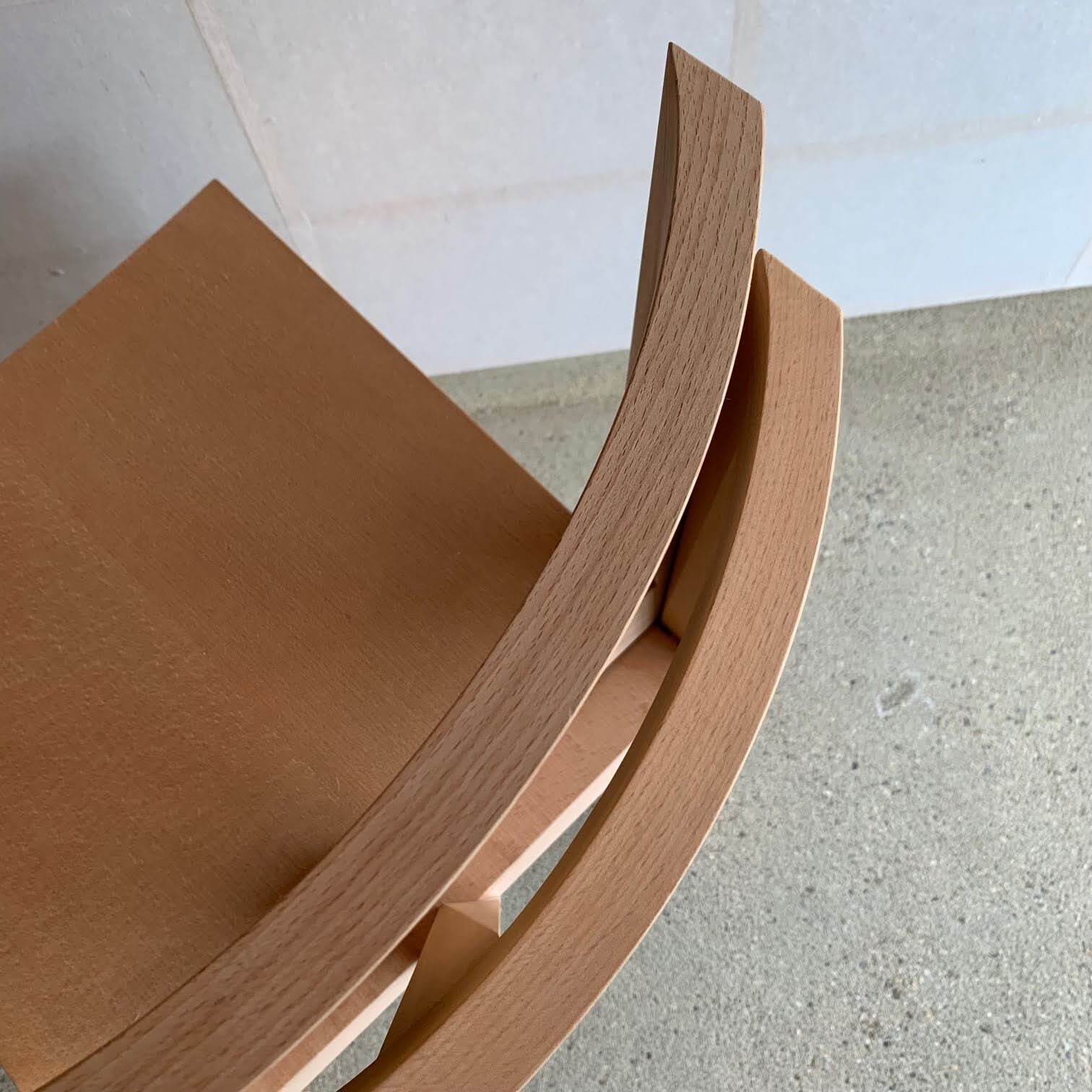 トーベン・スコウ (Torben Skov) が描いたこの椅子は、無駄を削ぎ落とした線と面の構成によって、木そのものの魅力を際立たせています。緩やかに弧を描く背のラインは、視覚的な柔らかさと同時に身体を自然に受け止める機能を備え、中央に通る一本の支えが全体に緊張感と安定感を与えています。